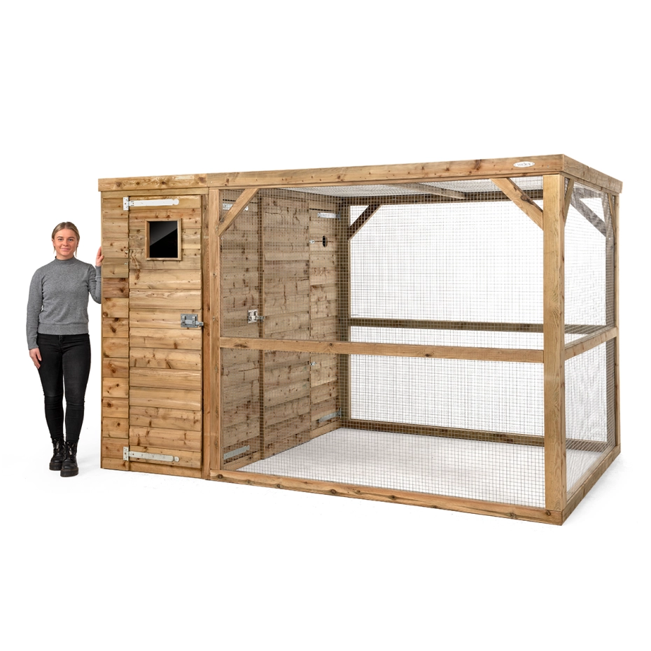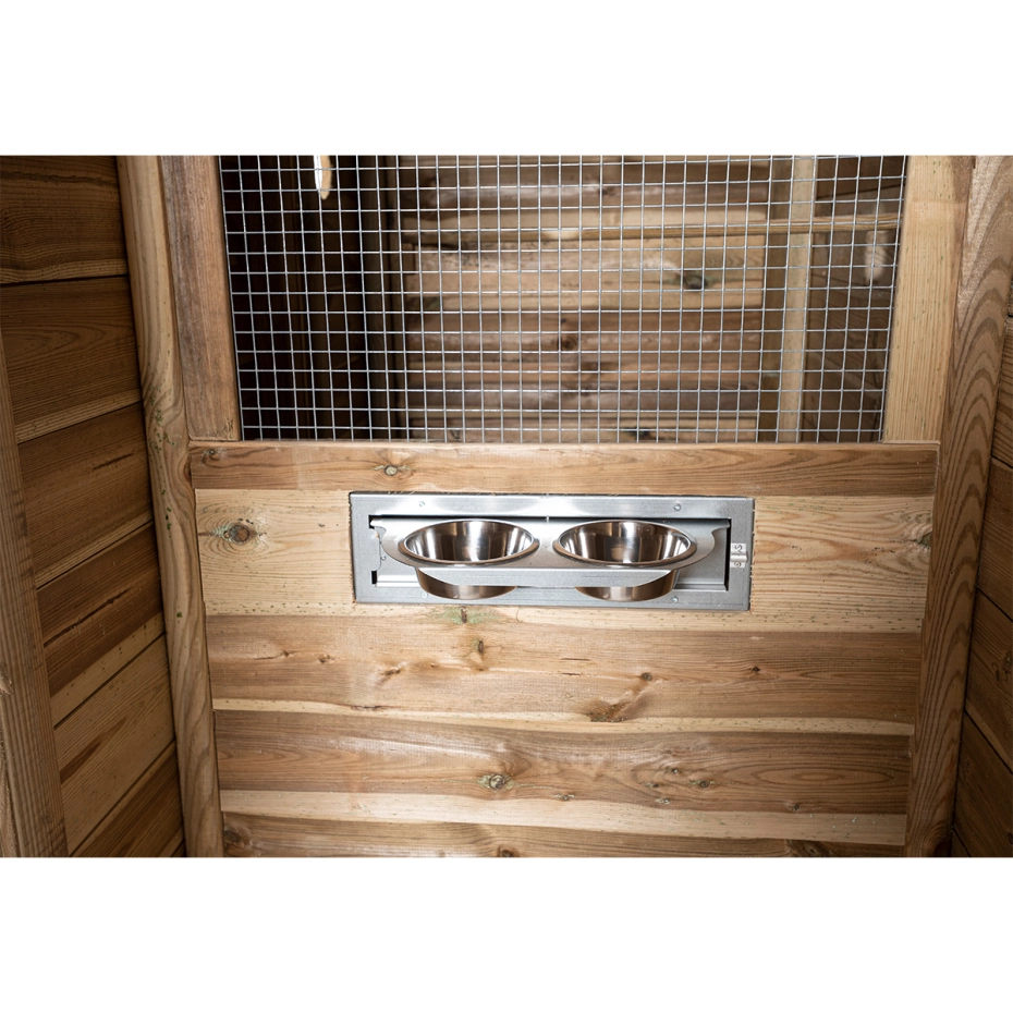 - Het dierenverblijf wordt gedeeltelijk gemonteerd geleverd: houten nachthok en sluis zijn gemonteerd; de ren wordt geleverd als bouwpakket