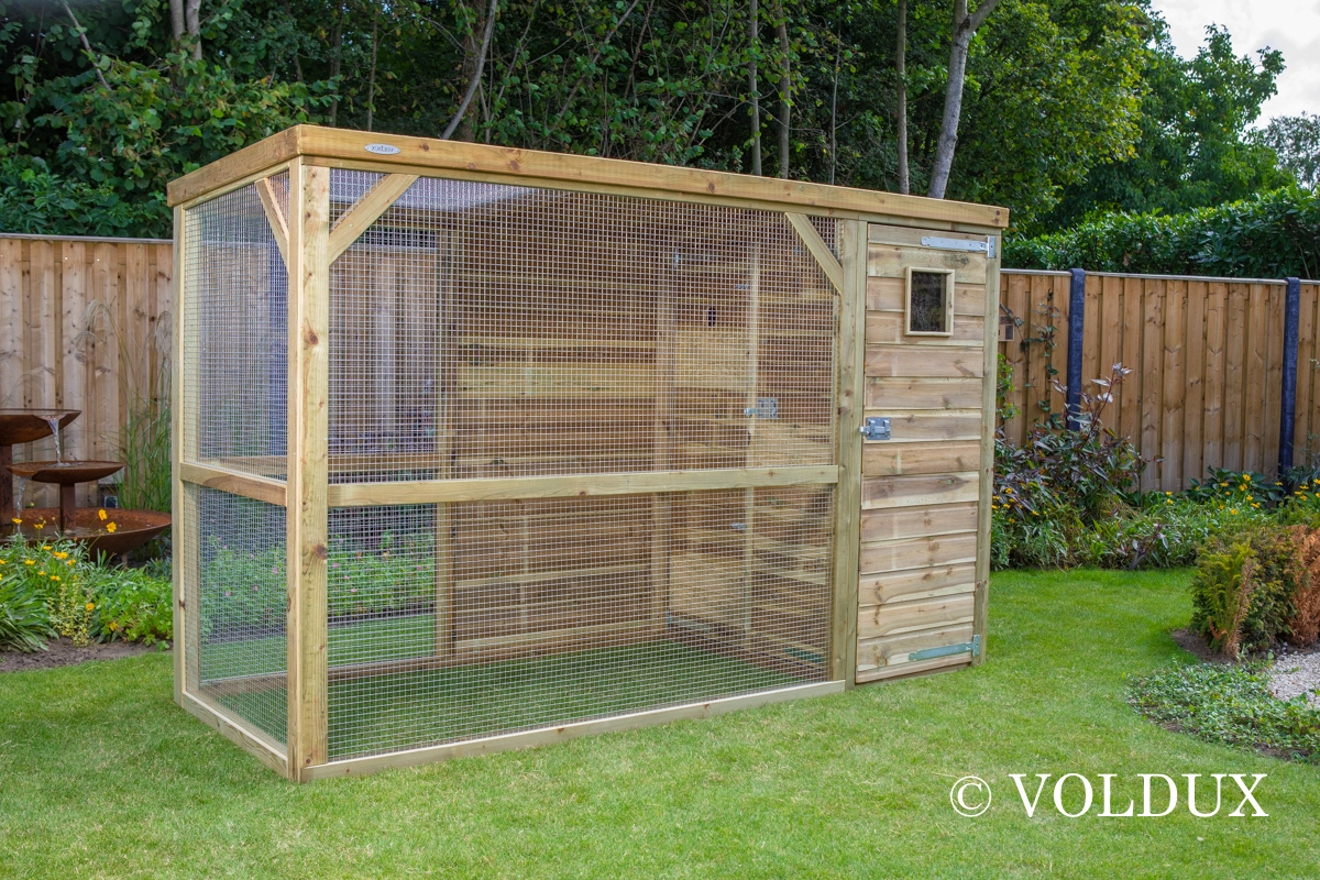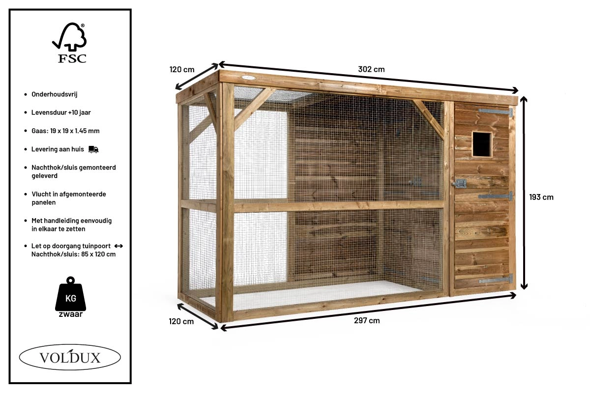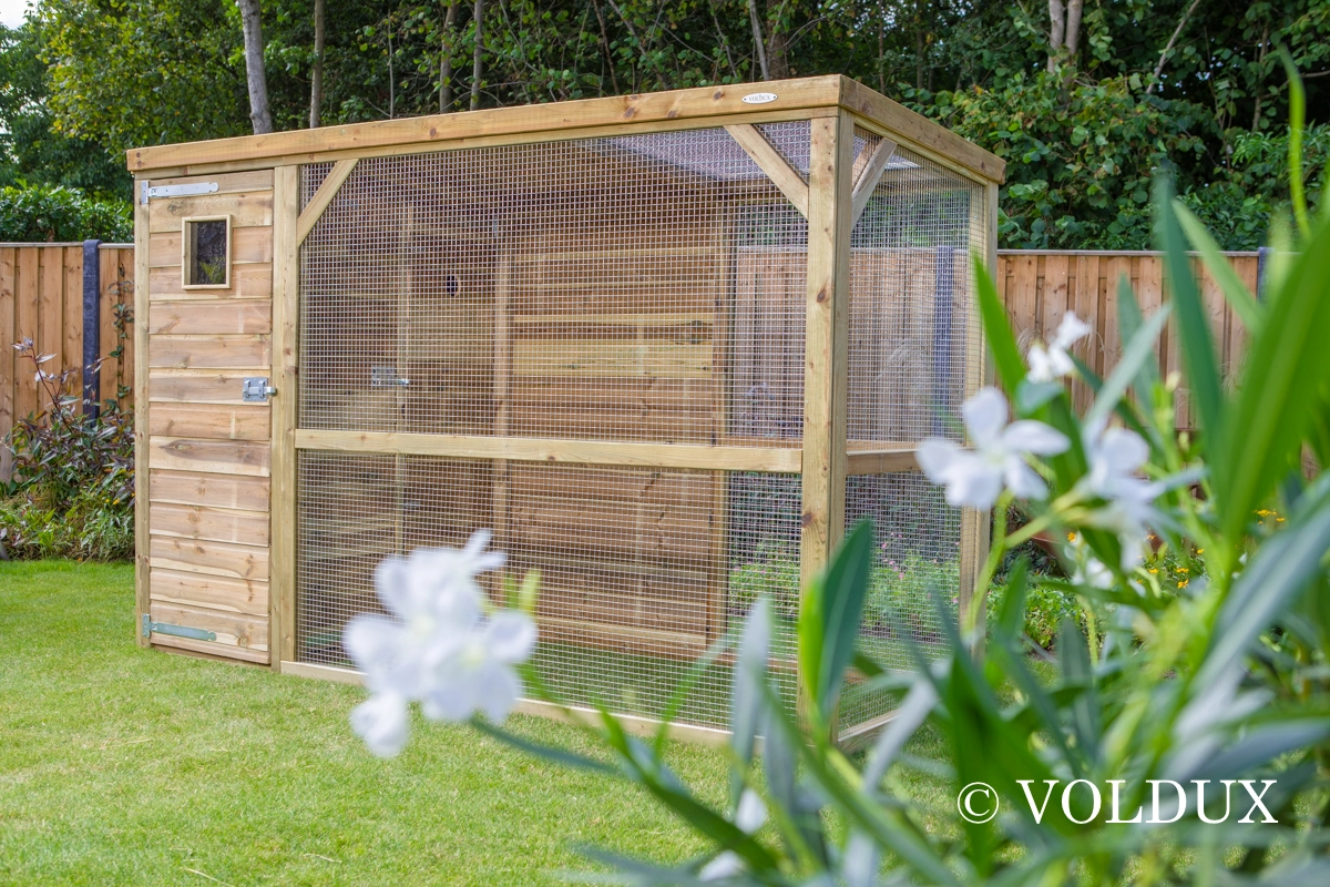 Volière Toon Voldux is een zeer praktische Volière. Dit komt omdat het een draaibaar voedersysteem en een sluis heeft, waardoor de kans dat de vogels ontsnappen erg klein is. Verder is de hoogte van de volière praktisch: voor u, en voor de vogels. Nachthok/sluis worden gemonteerd geleverd, ren wordt in panelen geleverd. Volière is eenvoudig te monteren. De volière heeft een levensduur van +10 jaar.