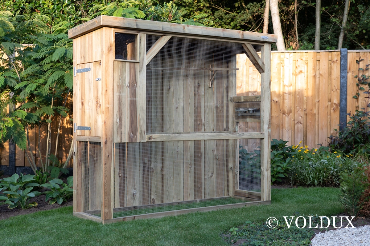 Vogelvolière R1 is gemaakt van geïmpregneerd grenenhout. Hierdoor is deze volière onderhoudsvrij. De volière R1 is dus zeer geschikt voor buiten, zonder dat deze gebeitst of geschilderd hoeft te worden. Vogelvolière R1 heeft een deur met een draaibaar voedersysteem met 2 bakken. Vogels kunnen zo gemakkelijk gevoerd worden zonder dat ze kunnen ontsnappen. Deze volière heeft een vlucht of ren met zitstokken.