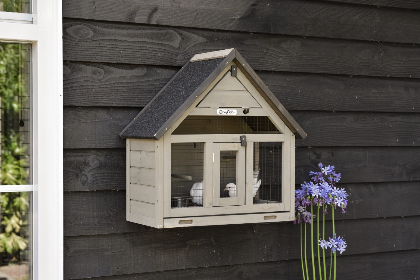Wandvolière Matty Small is perfect voor 2 kleine vogeltjes. De handige schuiflade met gaaspaneel erboven zorgt ervoor dat je vogels veilig blijven tijdens het schoonmaken. Het nachthok is afsluitbaar, er zijn 3 zitstokken inbegrepen en met de meegeleverde haakjes hang je de volière eenvoudig aan de muur.